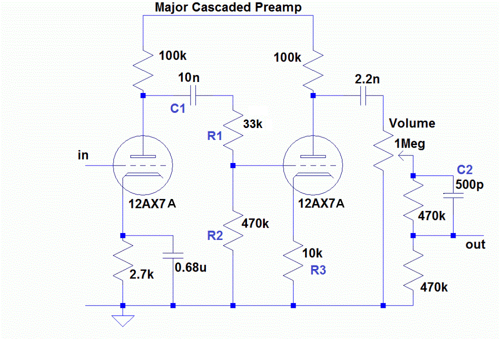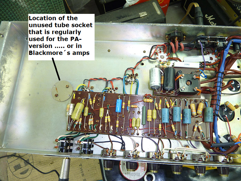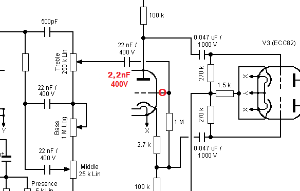 After the four system mods to make the stock Major more stable, now a few sound mods. The stock input cap (22nF/400V) of the cathodyn stage is too big. If you overdrive the Major at full tilt, this cap produces a so-called "blocking distortion" - the bass loose its definition and tightness by attacking the strings - the bass frequency sounds fuzzy. Therefore this 22nF cap must be reduced. A good value to start with is 2,2nF/400V. The more you play heavy overdrive, the smaller this cap should be. Furthermore, set in position of the red circle directly in front of the cathodyn´s grid a 150kOhm resistor (grid-stopper).