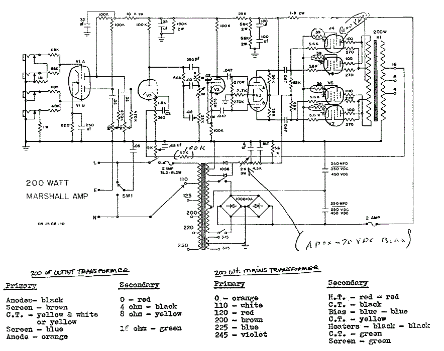 The DP_Mk2 sound of Ritchie Blackmore is dominated by the combination of a treblebooster and a 200 watt Marshall Major amp. The circuit of the Major amps is very unique and has nothing to do with the common 50 and 100 watt models. So the 200 watt Marshall Major is not a louder 100 watt Marshall amp, the Major has a very special tone. During the years, several versions of 200 watt amps had been released, the first edition from 1967 named "Marshall 200" and nicknamed "the pig" (two inputs, three controls for bass, treble and volume) is not important for us here. Only the later versions from 1968-1974 with the typical Marshall cosmetics, four inputs and six controls named "Marshall Major" are important for us, because Blackmore played only this amps. The Marshall Major 200 Watt amp was built in two versions over the years, the first one being from 1968 until late summer/autumn 1969 with the 100ohm "Doorknob" anode resistor at the KT88 power-tubes, please see the schematics. Ritchie stated that during the complete MK1 era only the first series was used without any exception. The follow-up was the well-known production run that was divided into Lead - see schematics, Bass and PA series.