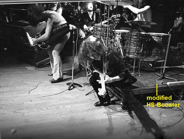 Ritchie then used the services of the late tech Bill Hough who was technical director of the UKs biggest PA rental company I.E.S. (International Entertainers Service Inc.). The company often provided the PA sound system for Emerson, Lake & Palmer and Deep Purple. Therefore the electronic wizard Hough was often in charge of the PA and looked after Keith Emerson's keyboards, because he knew everything about Hammond organs. The two groups often competed in terms of PA power and volume. By the way: Bill was also responsible for all the quadraphonic "Mavis" mixer designs e.g. used at the California Jam 1974 or by the Who. Obviously it was no wonder, Ritchie one time asked Bill for technical help. So Bill built a treblebooster for Ritchie that did not suffer from picking up radio signals and the (bit wah like) mid-rangy and compressed sound of the silicon Hornby Skewes booster. He built his electronics into the enclosure of the modified HS booster model with the additional volume control, by simply taking out all of the original guts. Hough's custom made silicon booster [CM] was also used from spring/summer 1971 until the end of the DP_Mk2 period in summer 1973.