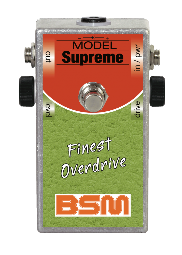 BSM decided to build a significant boutique overdrive pedal in order to add a different and more modern way of receiving the signature Blackmore sound additionally to the classic BSM full power Booster line: the SUPREME! If combines the medium output of an overdrive pedal with the typical Blackmore sound, so as to achieve Ritchie’s tone immediately with most amps bright channel independently from the SUPREMES’ output adjustment. The drive-control is there to set perfectly Ritchie’s gain-shadings over the last four decades of his rock-artistic development. The basic tone is very beefy with direct bass, punching mids and uncoloured treble.
